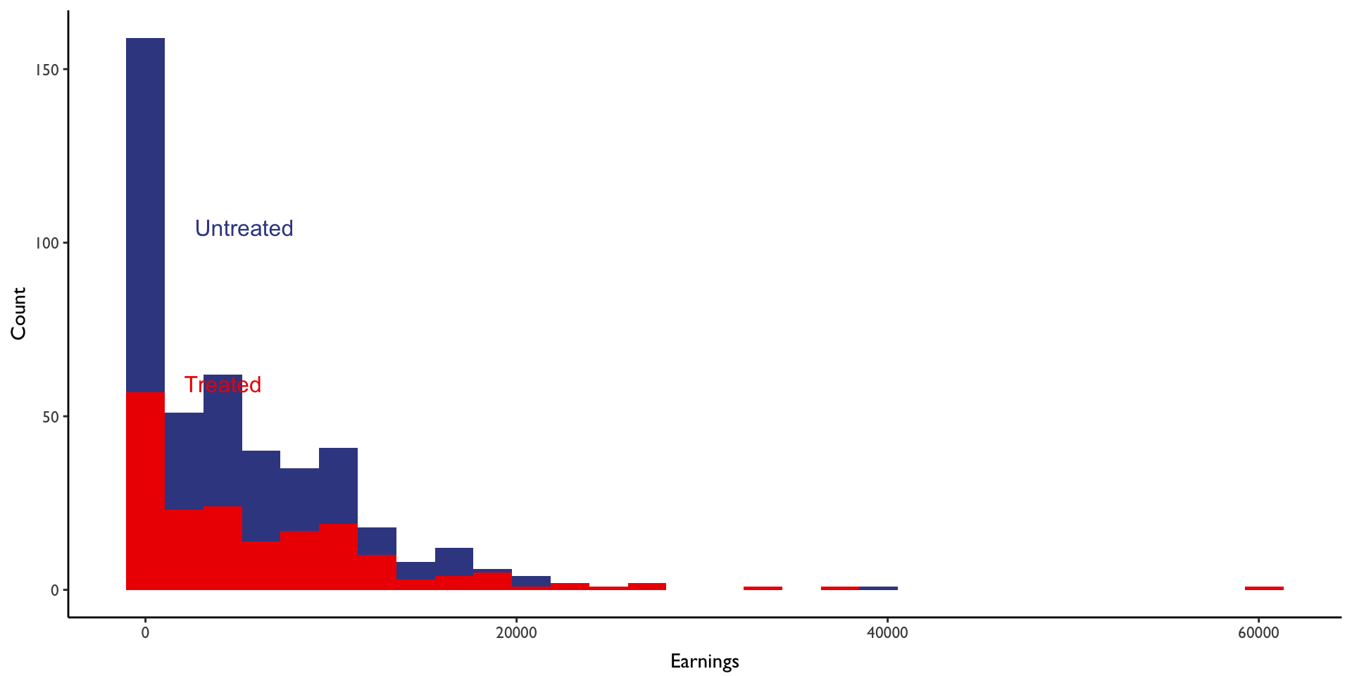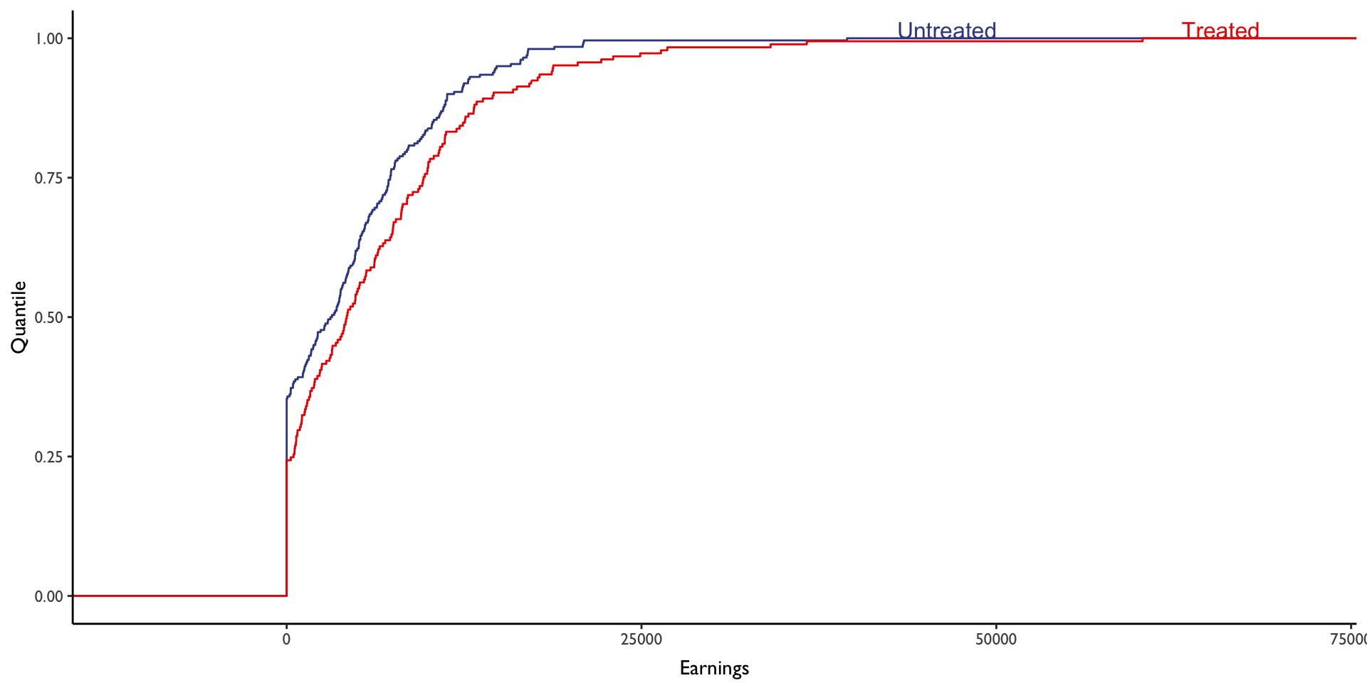 We see here that the two distributions have separated a bit, though there are regions where they essentially overlap. Just shy of the 25th percentile, for example, the two distributions overlap at around $0 in income; there doesn’t appear to be any change in earnings for treated individuals within the bottom quarter of the income distribution.