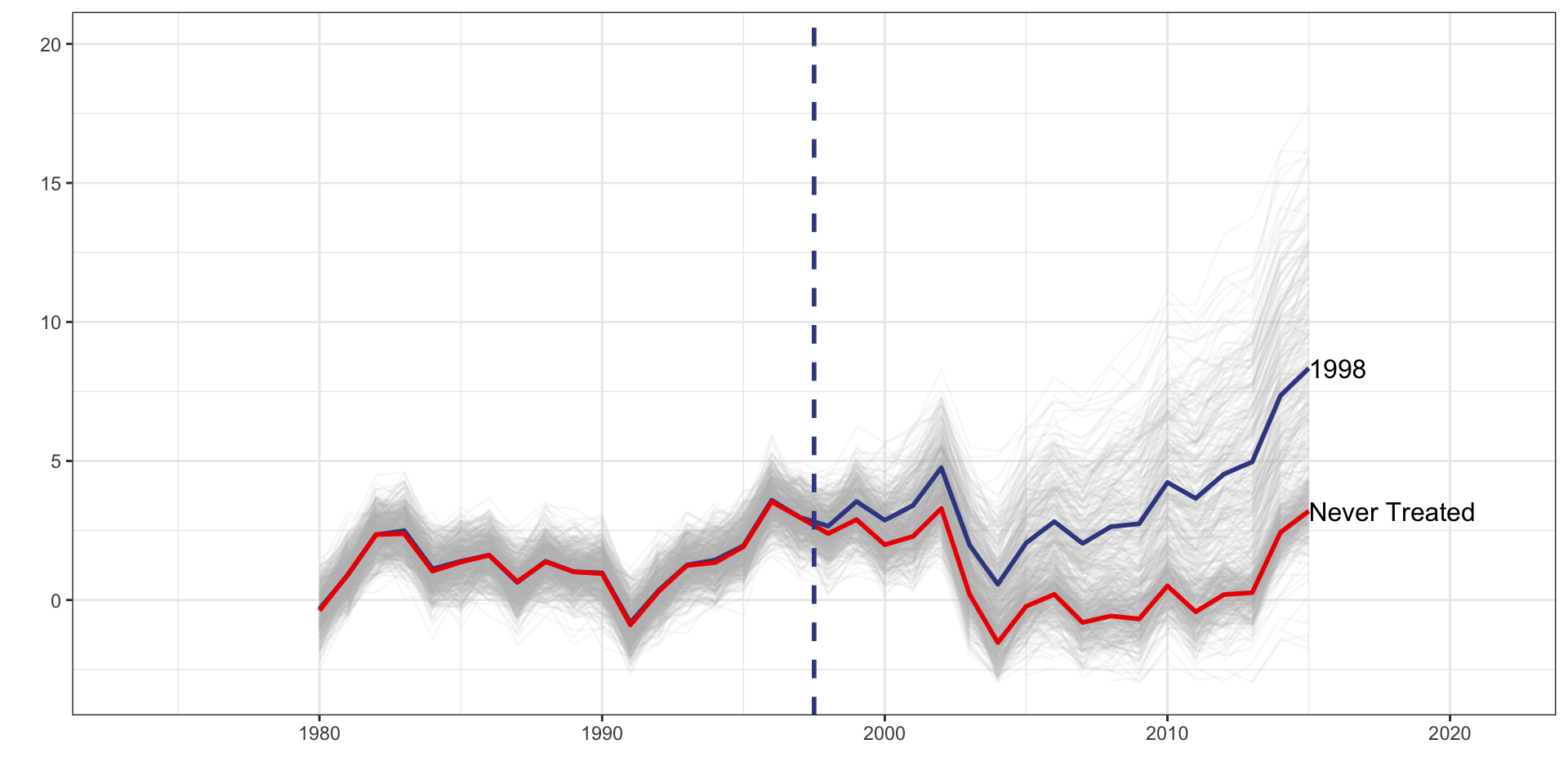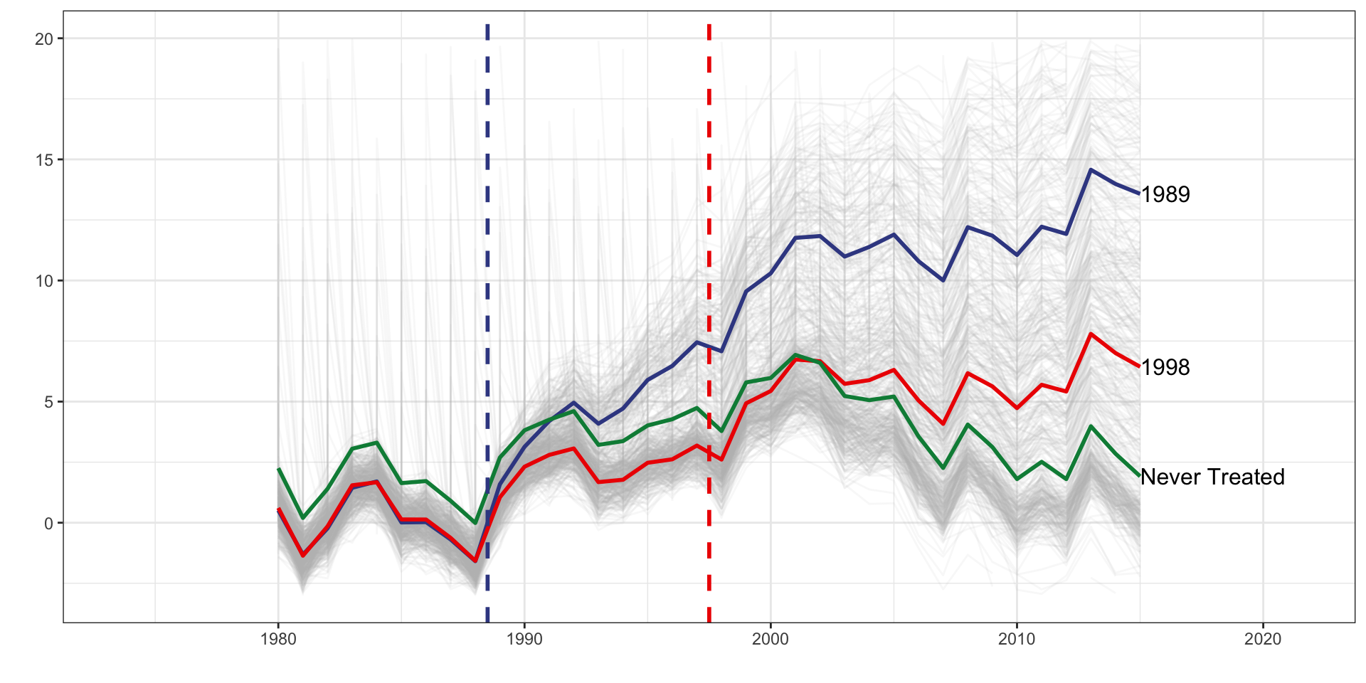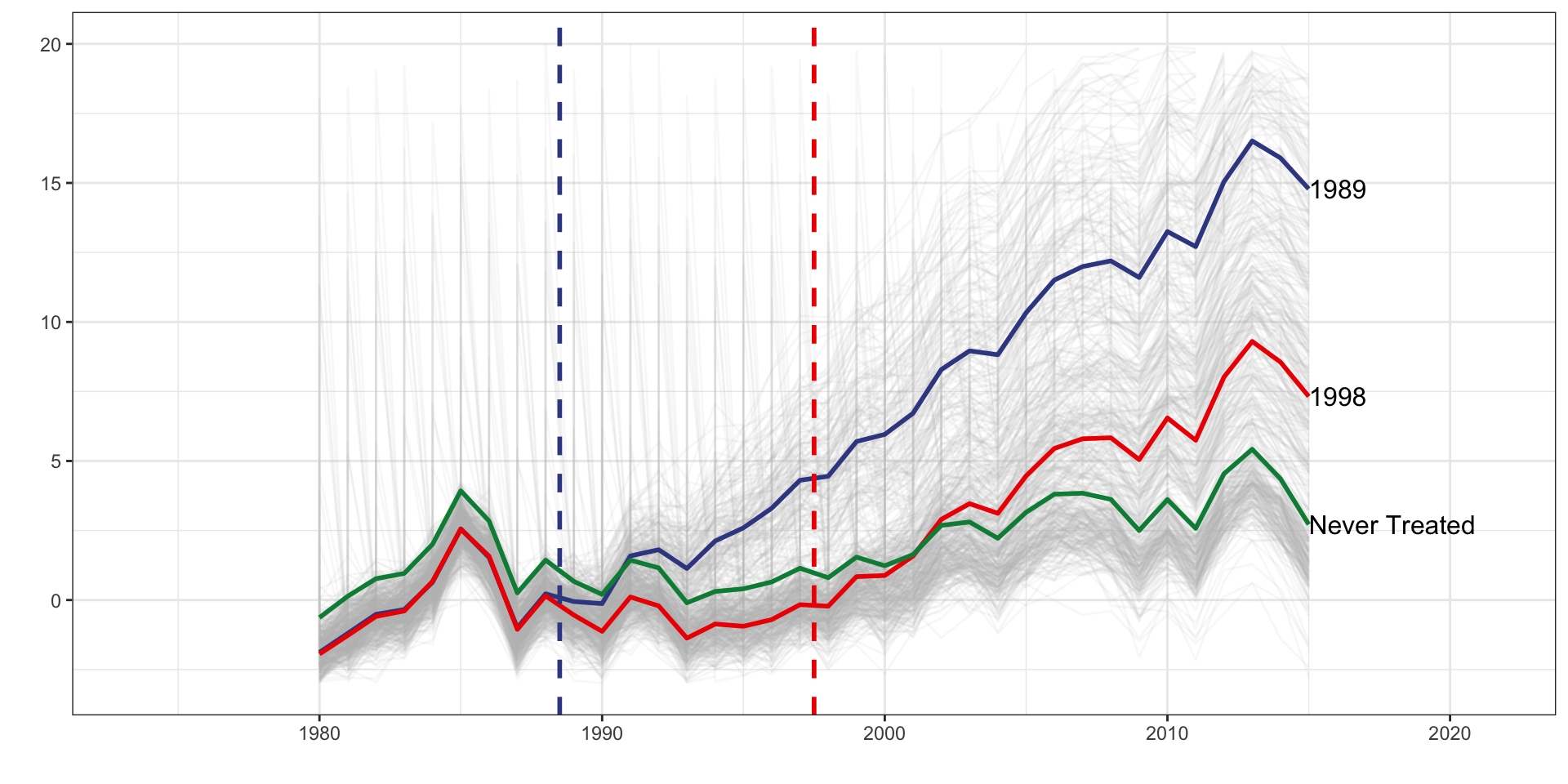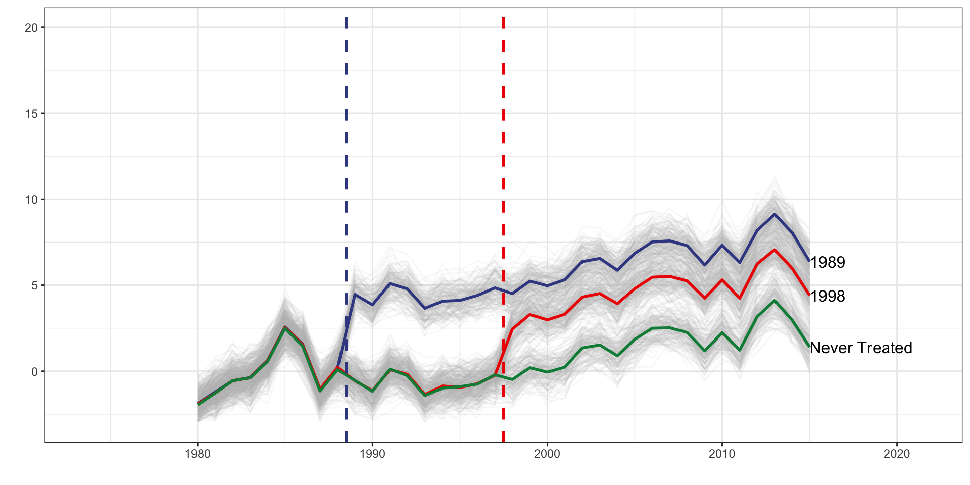 d_1989 is a dummy set to one if the unit belongs to the 1989 treatment cohort.d_1998 is a dummy set to one if the unit belongs to the 1998 treatment cohort.f_* covers year dummy variables from 1989 to 2015d_1989 * f_1989d_1989 * f_1990d_1989 * f_1991d_1998 * f_1998d_1998 * f_1999d_1998 * f_2000