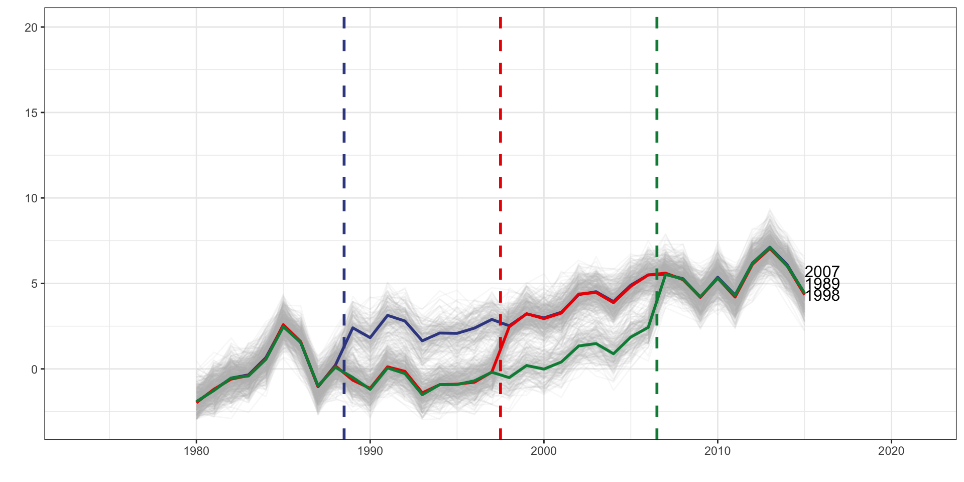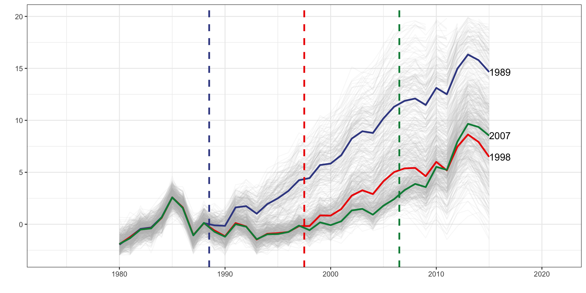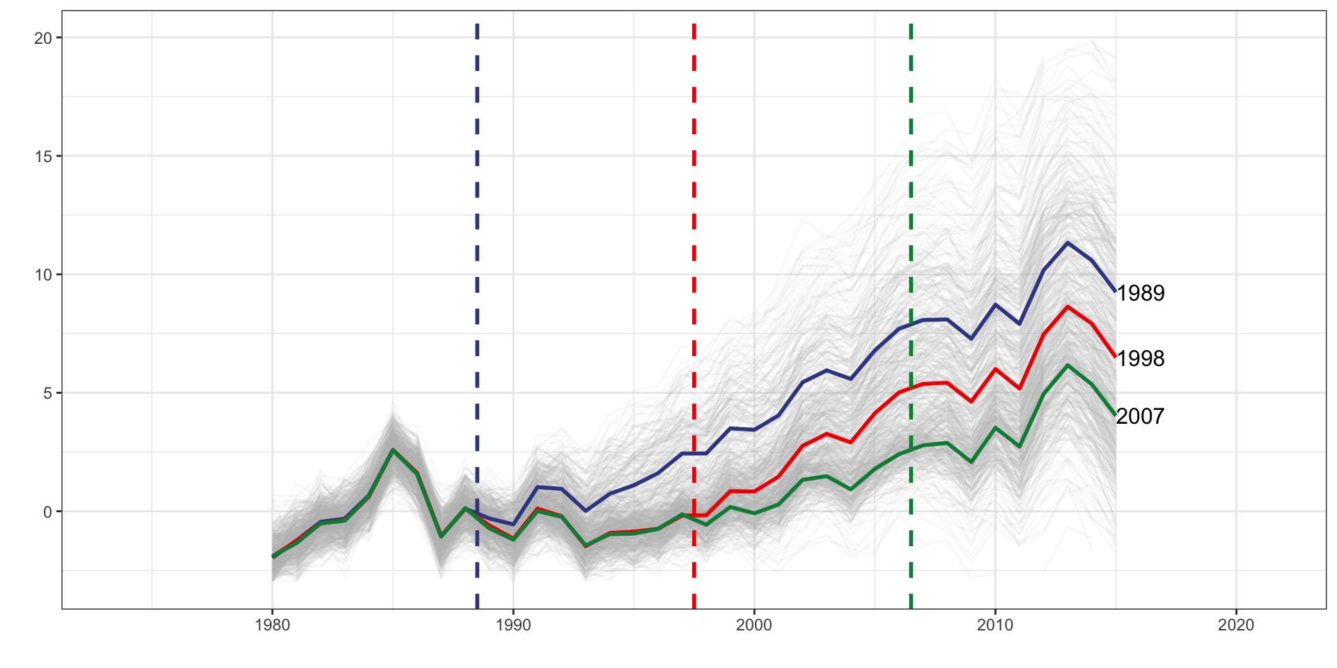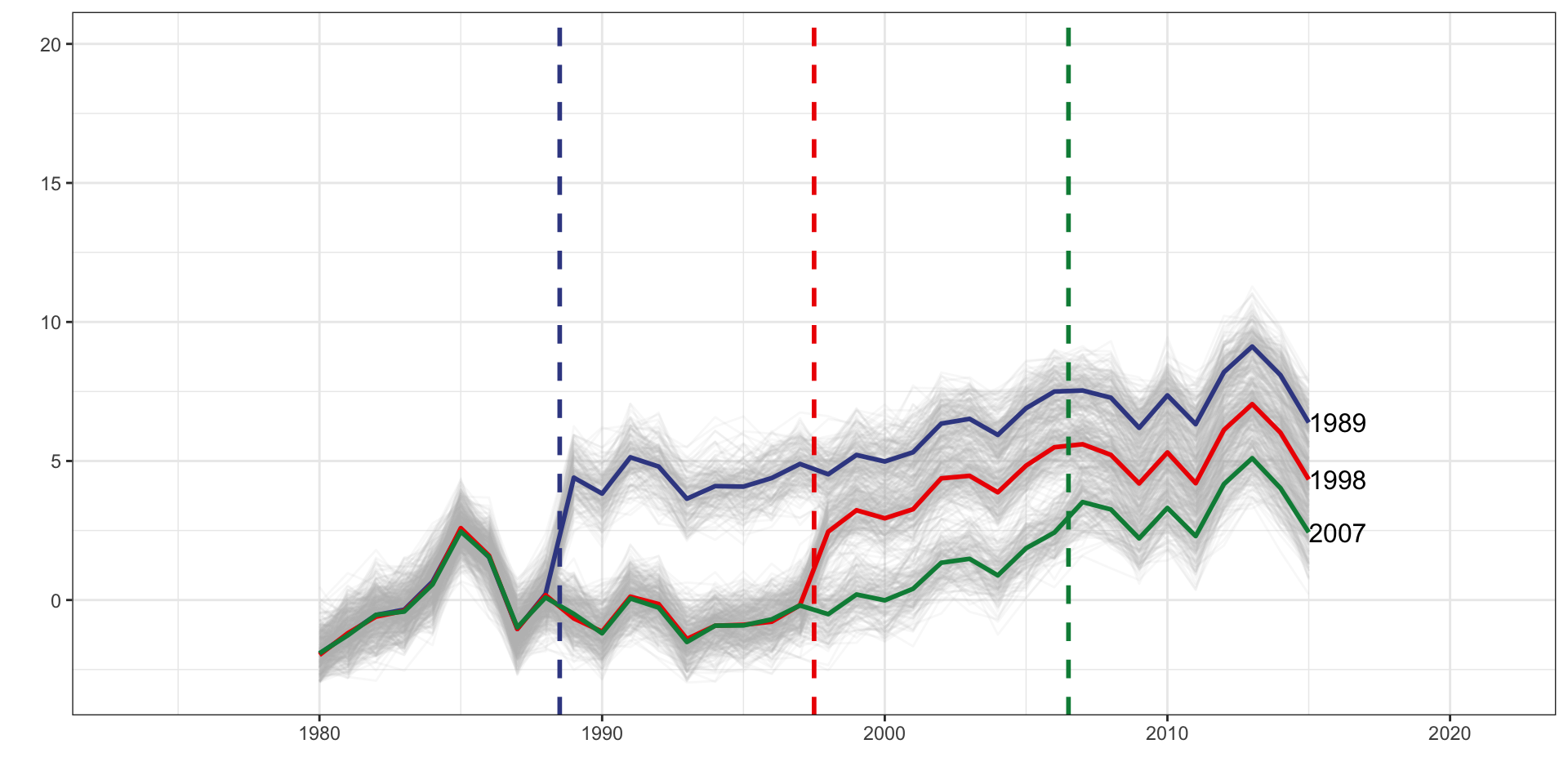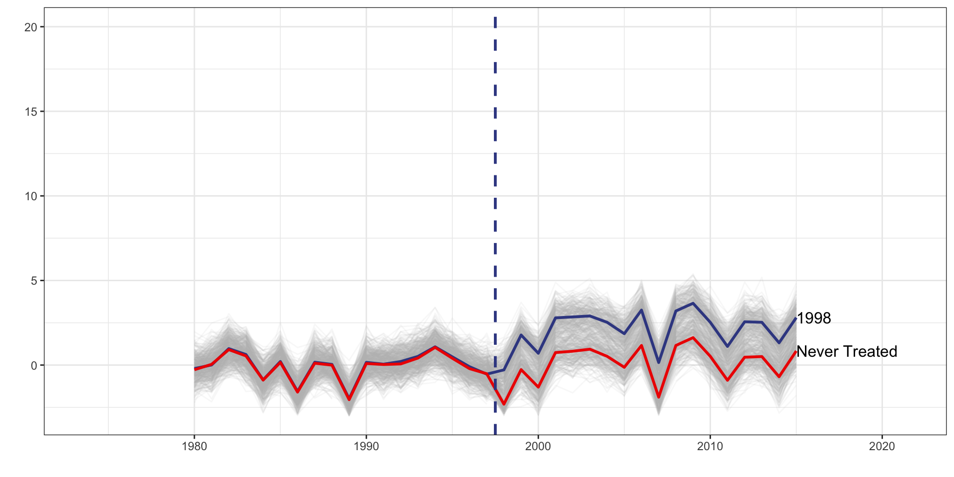 d_1989 is a dummy set to one if the unit belongs to the 1989 treatment cohort.d_1998 is a dummy set to one if the unit belongs to the 1998 treatment cohort.f_* covers year dummy variables from 1989 to 2015d_1989 * f_1989d_1989 * f_1990d_1989 * f_1991d_1998 * f_1998d_1998 * f_1999d_1998 * f_2000