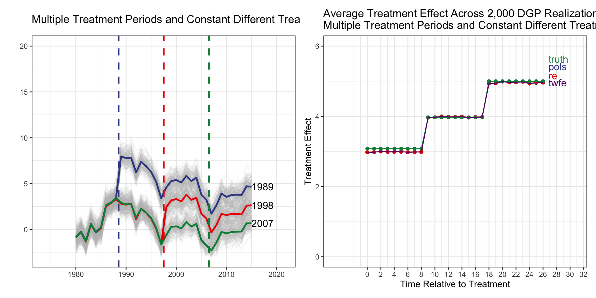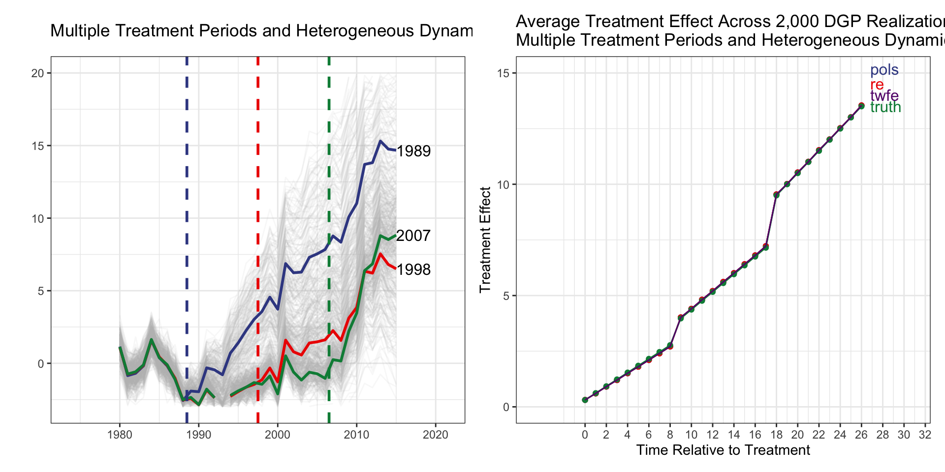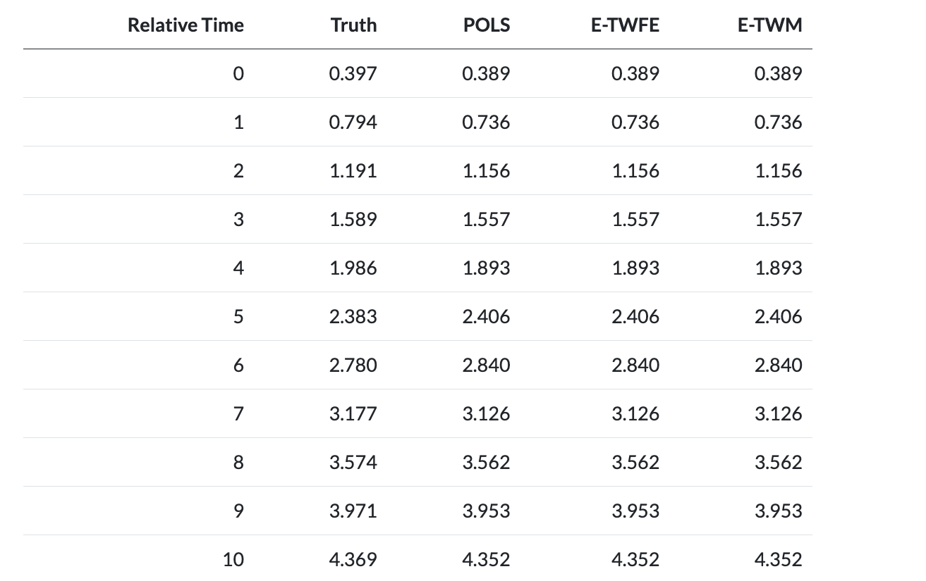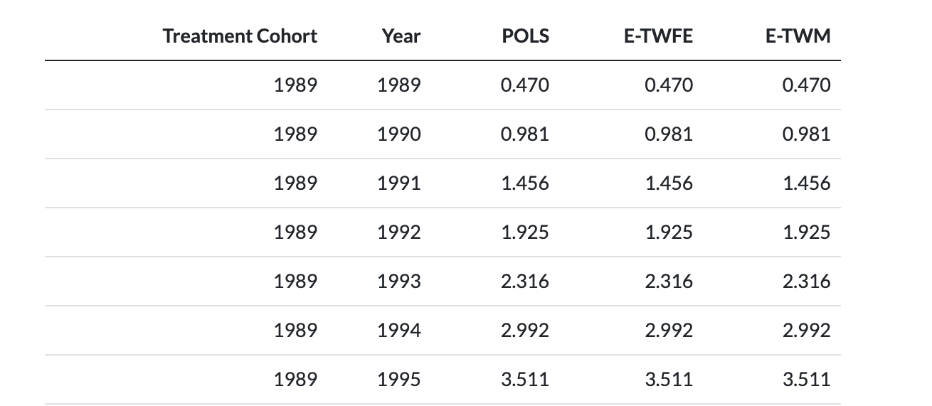 I(d_1989 * f_1989) corresponds to relative_time=0.I(d_1998 * f_1998) corresponds to relative_time=0.| Treatment Group | Timing | Heterogx | Tx Effect | TWFE | TWFE-ES | Ext-DID |