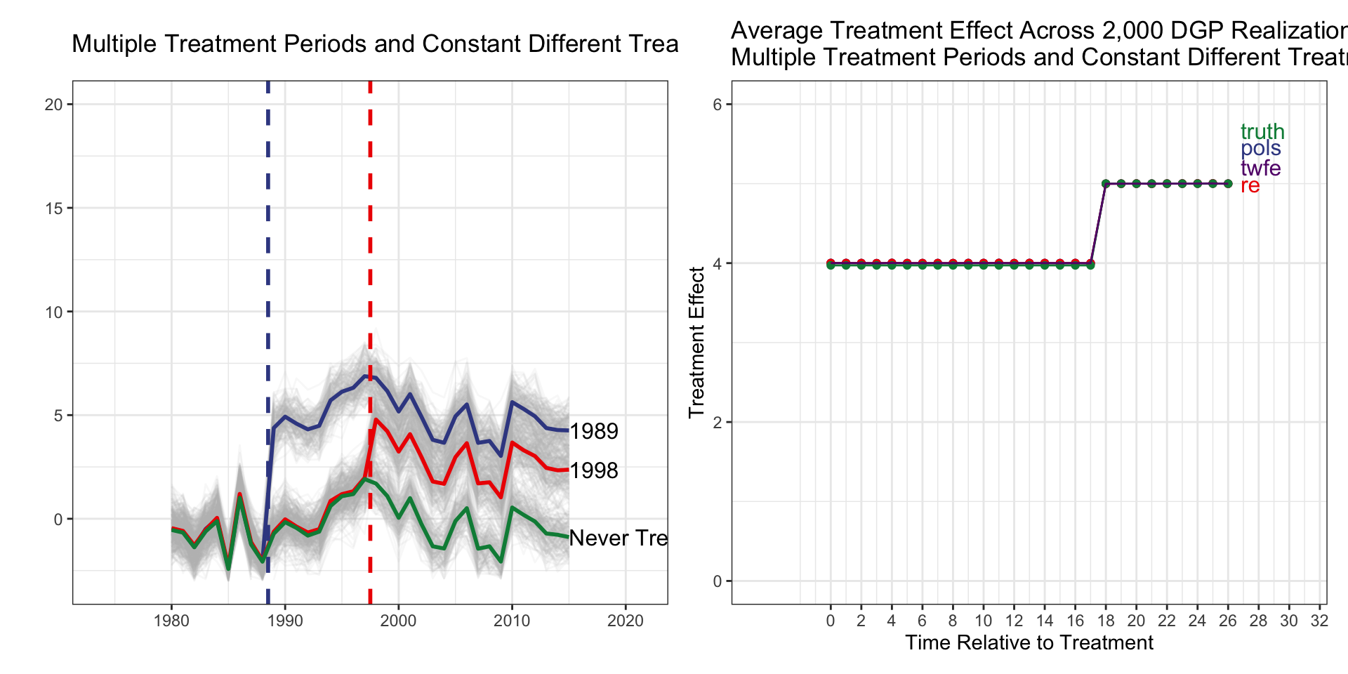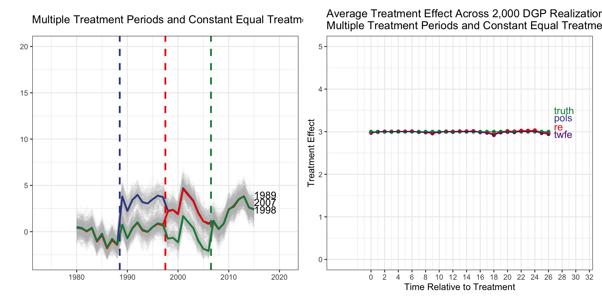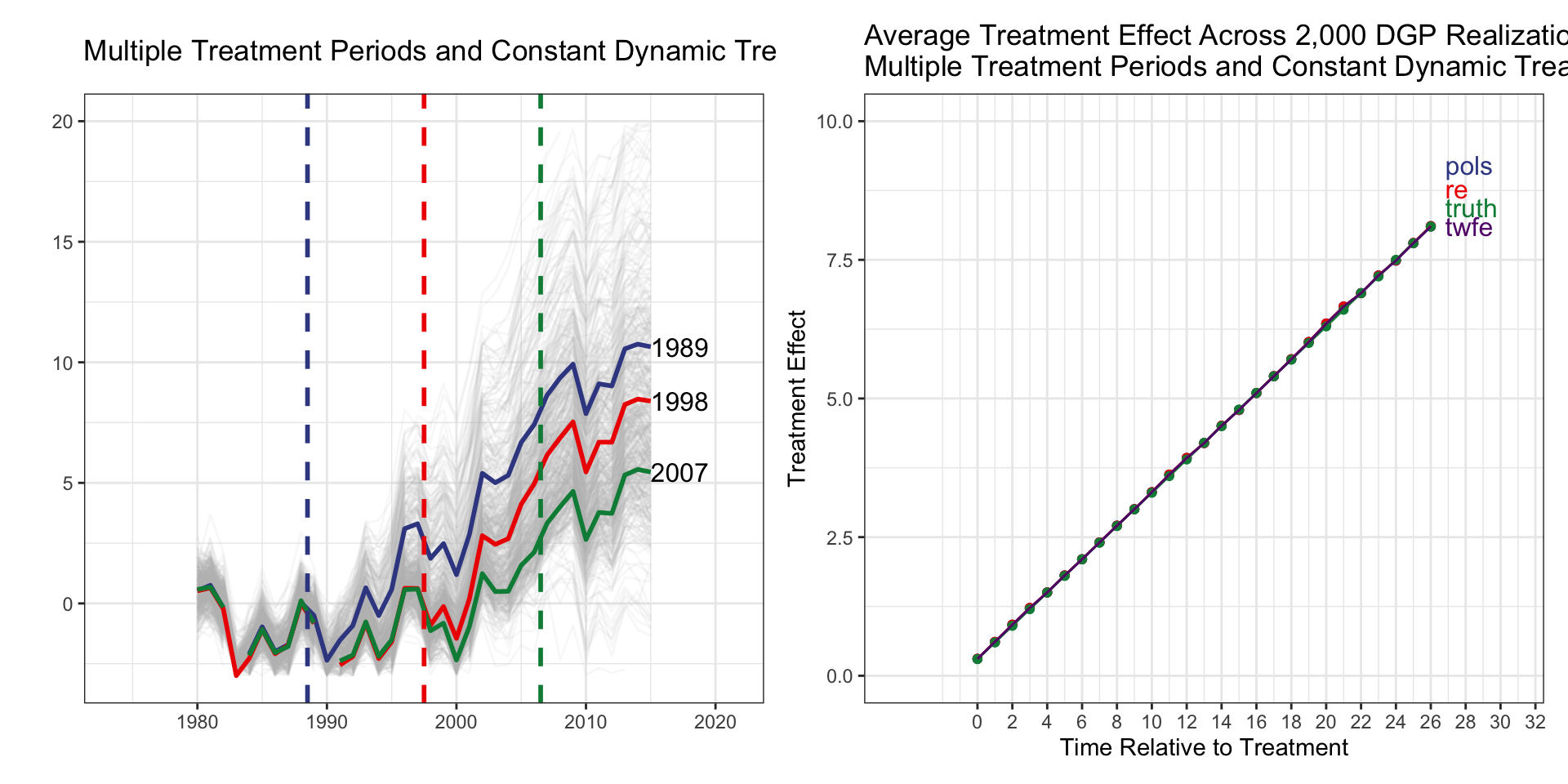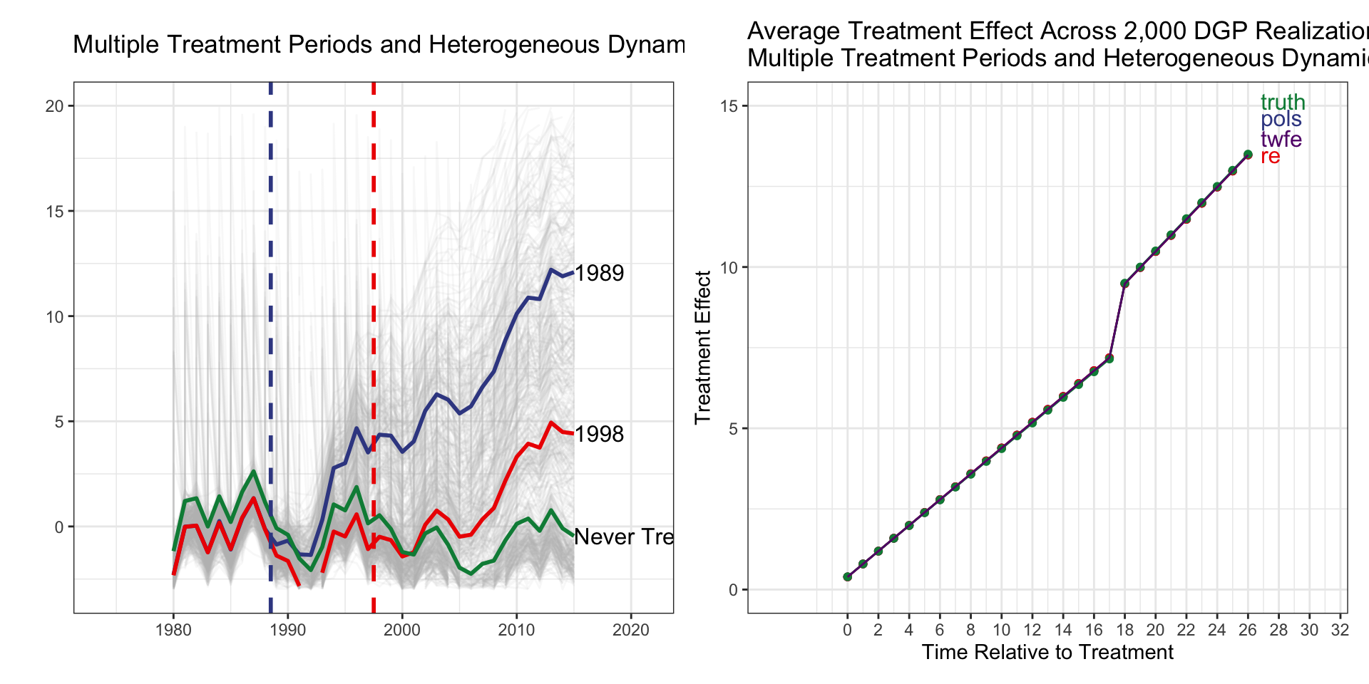 I(d_1989 * f_1989) corresponds to relative_time=0.I(d_1998 * f_1998) corresponds to relative_time=0.| Treatment Group | Timing | Heterogx | Tx Effect | TWFE | TWFE-ES | Ext-DID |