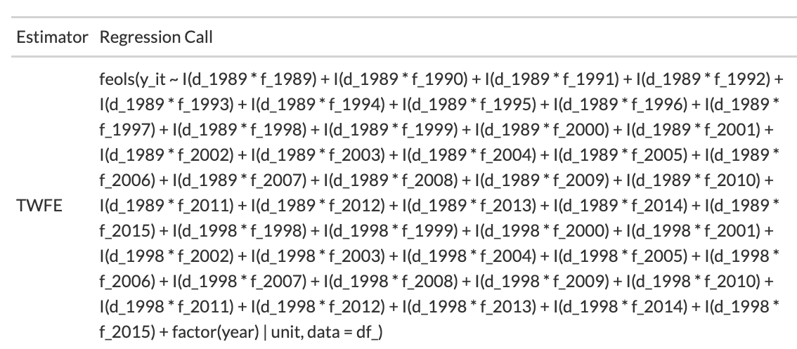 | Two-Way Fixed Effects | feols(I(d* : f*) + factor(time) | unit) |