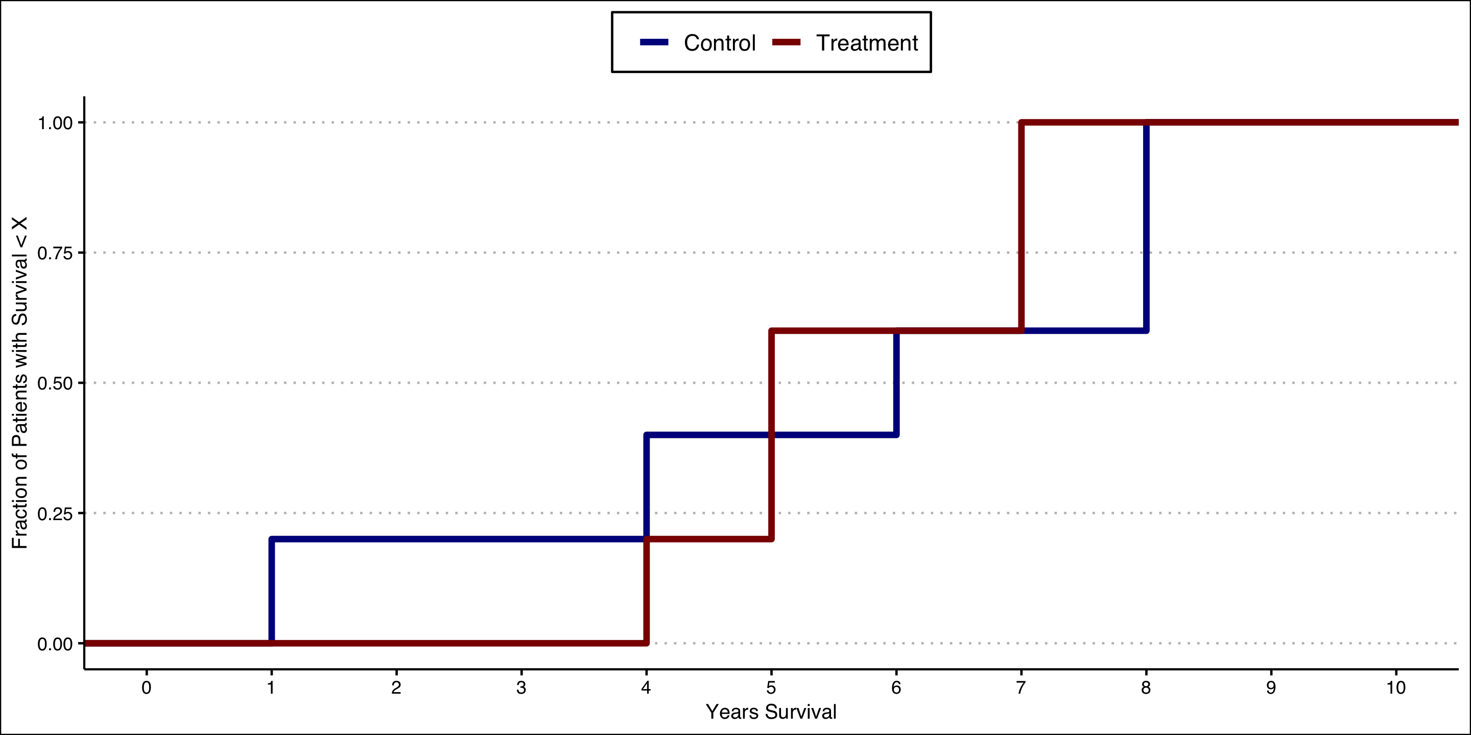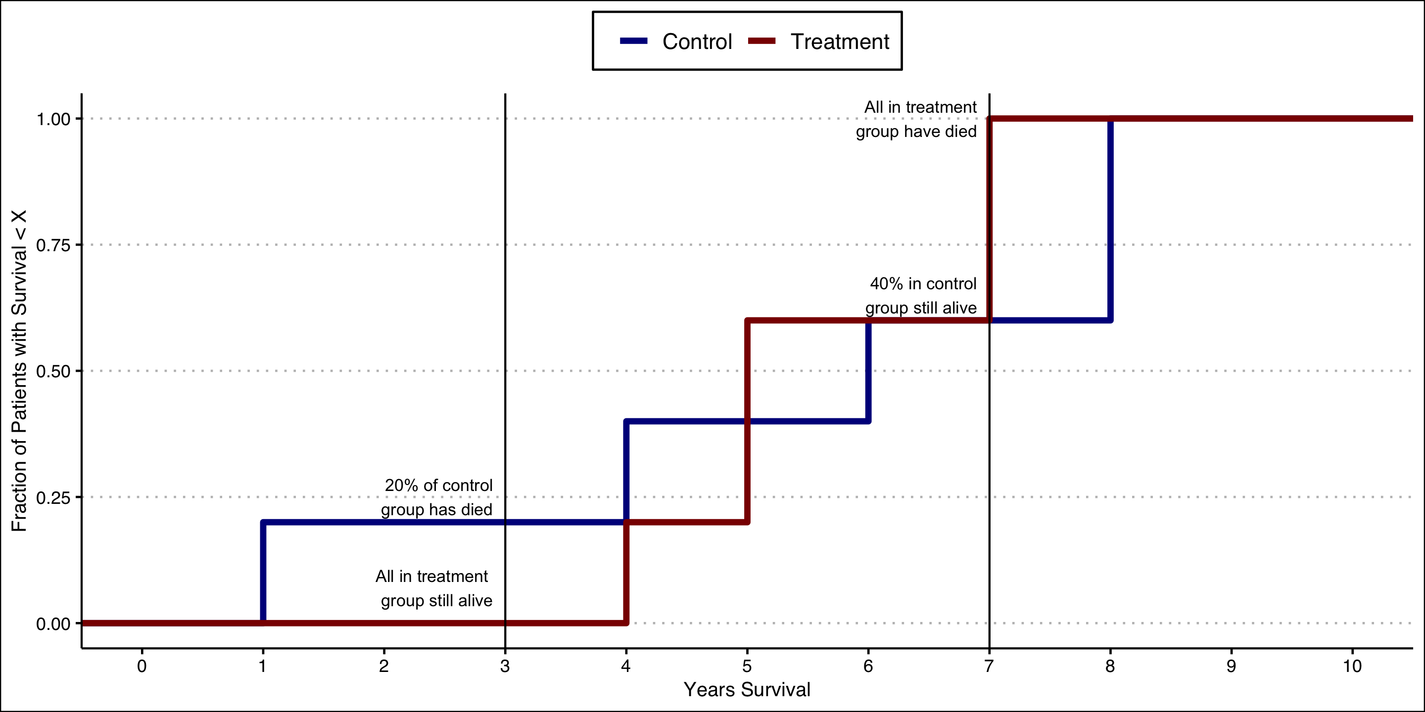 Recall from a few slides back I noted that “at 3 years the entire treated group is still alive, but 20% of the control group has died.”