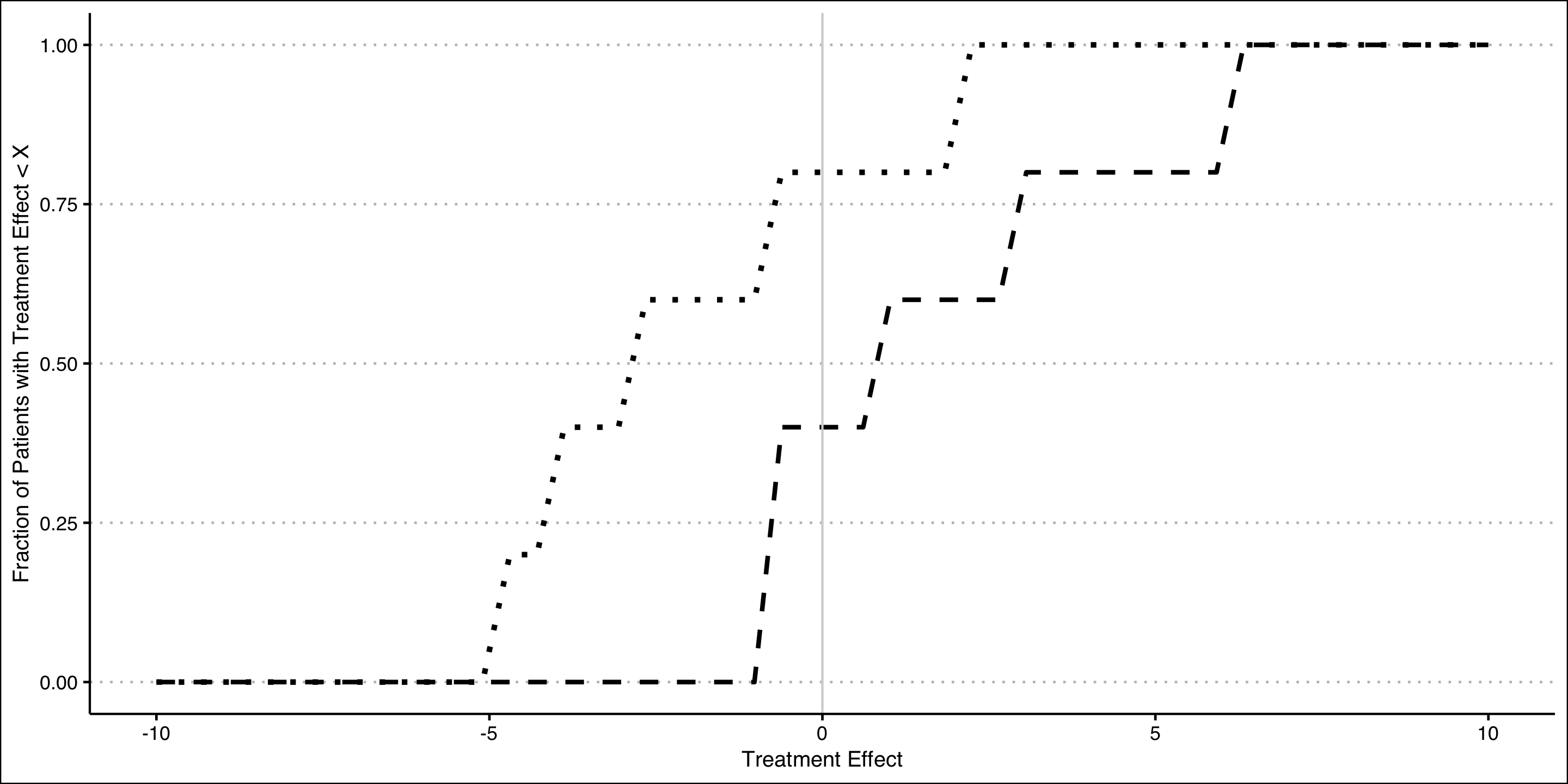 Indeed, we see that 5 patients (50%) have treatment effects (Difference) of 0 or below.
