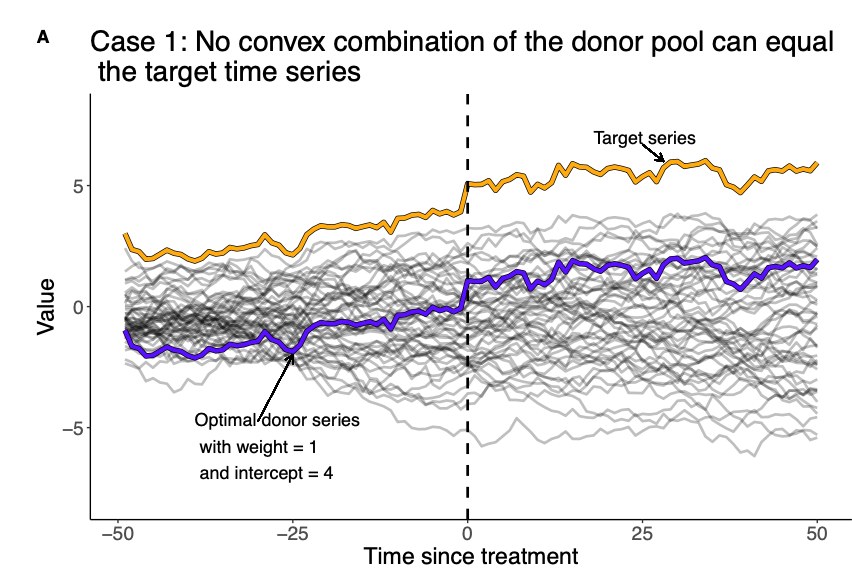 - Imposing these constraints allows you to create a counterfactual whose outcome trajectory is within the support (“convex hull”) of donor units (i.e., other states)