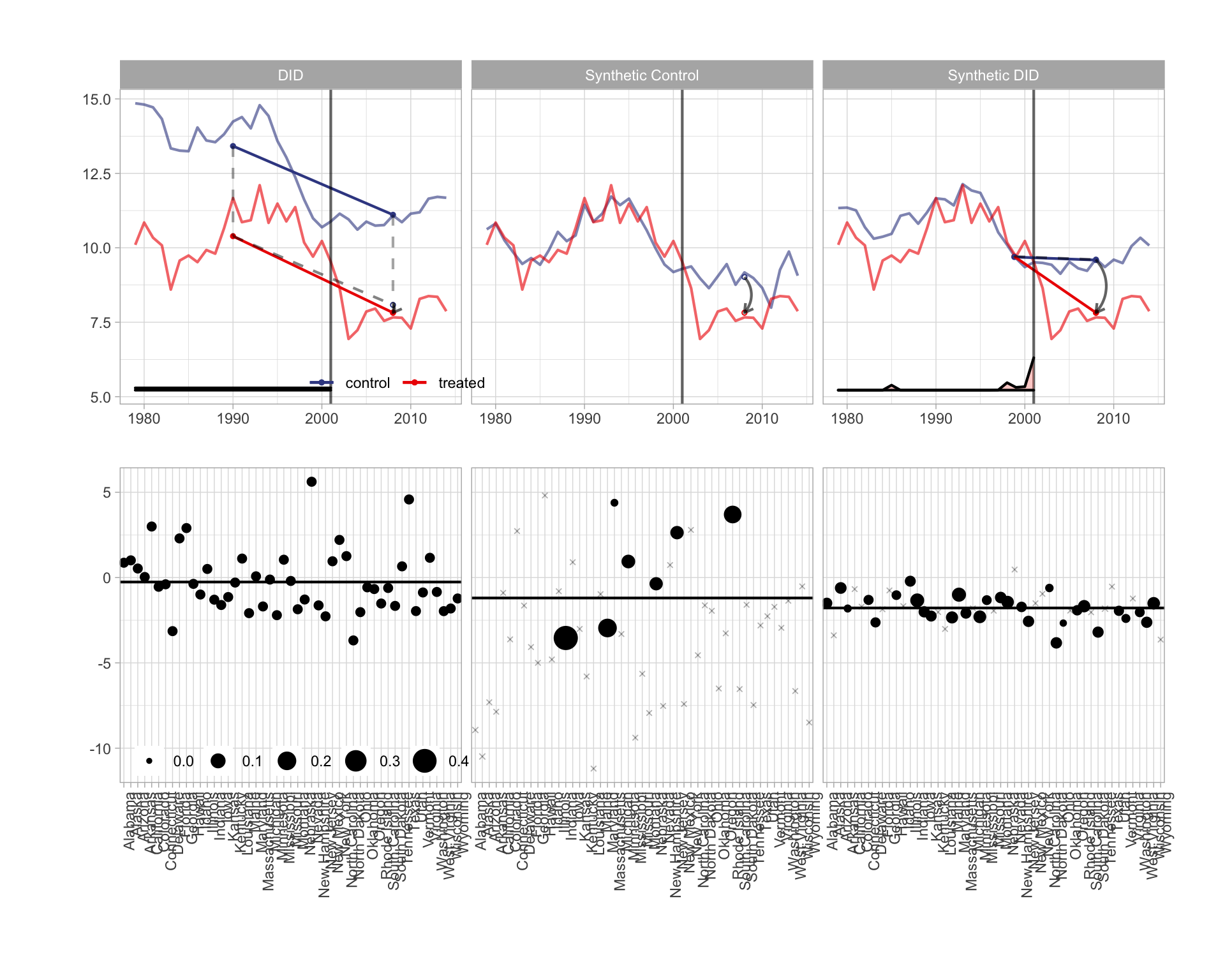 - Synthetic DID approach relaxes the parallel trends assumption.