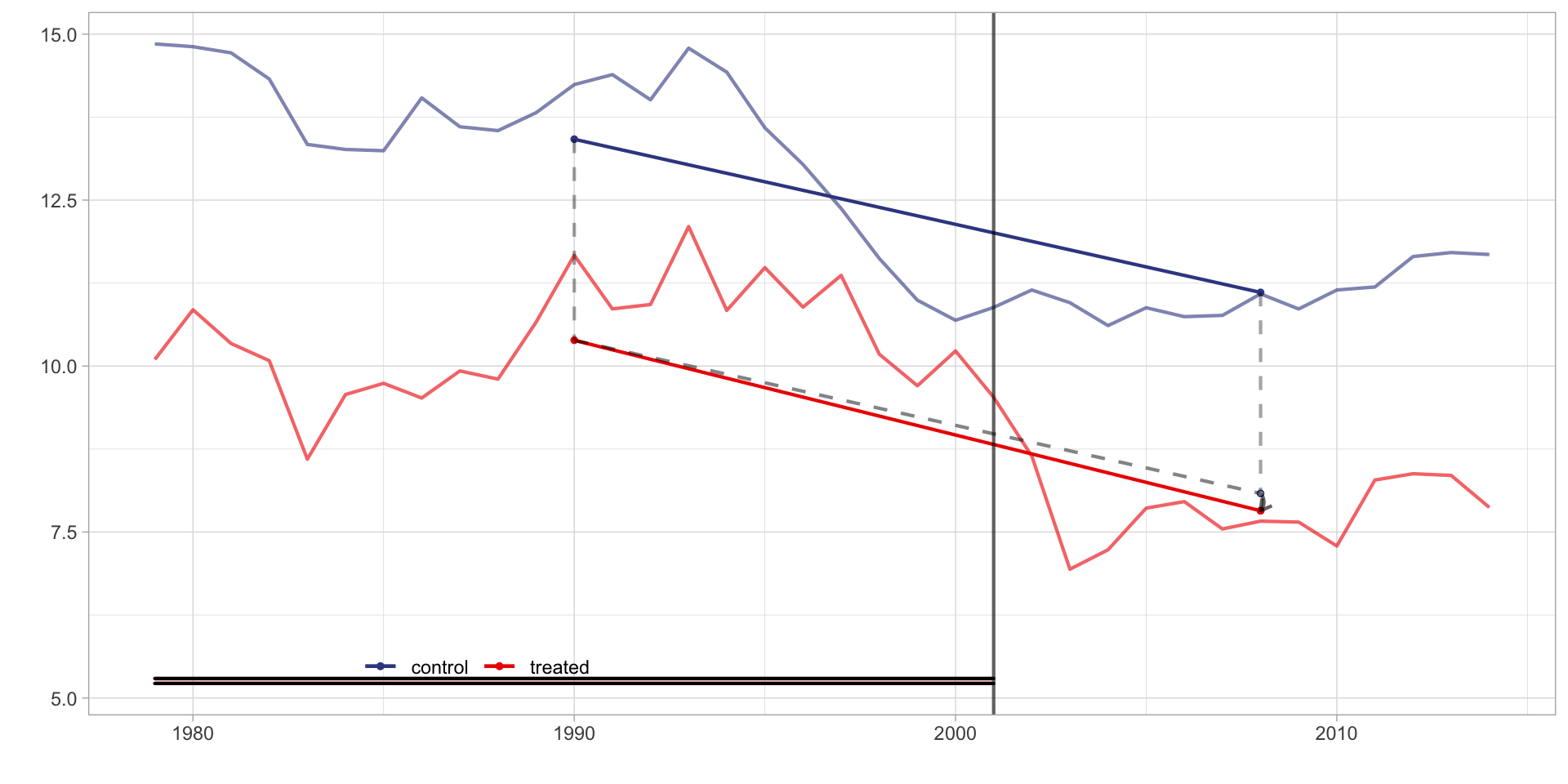- Difference in average pre-treatment outcomes between treated and control units is subtracted from the difference in average posttreatment outcomes