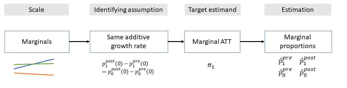However, this requires us to place parallel trends assumptions on two difference scales: the marginal scale and the transition scale.