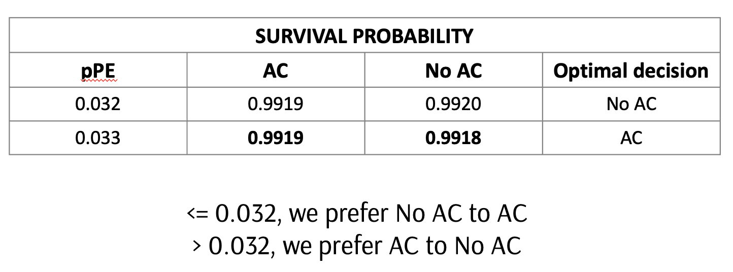 Expected value (No AC) = 0.750 * pPE + 1.0 * (1-pPE)