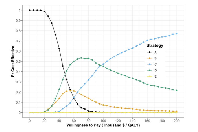 CEAC represents the (Bayesian) probability of each option being cost-effective at different levels of the cost-effectiveness threshold \lambda.