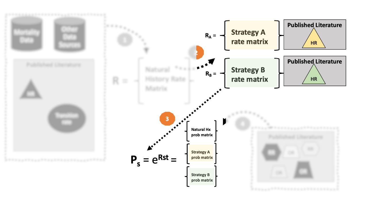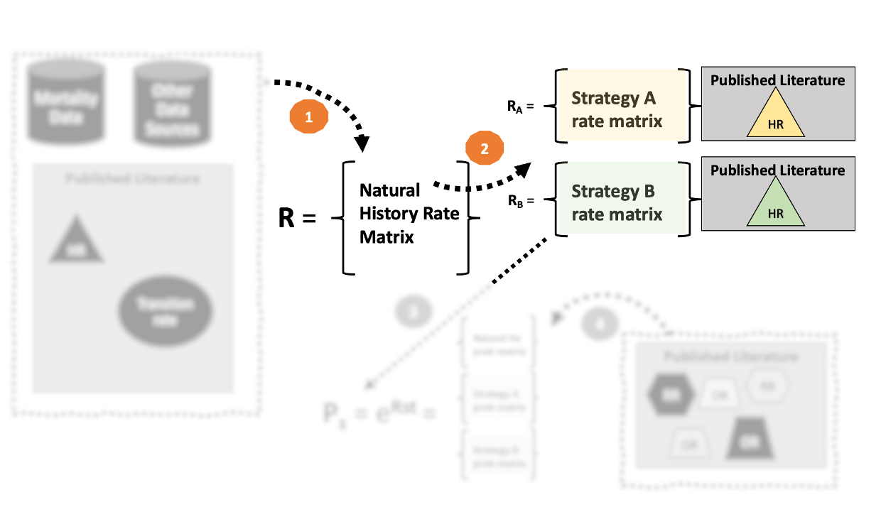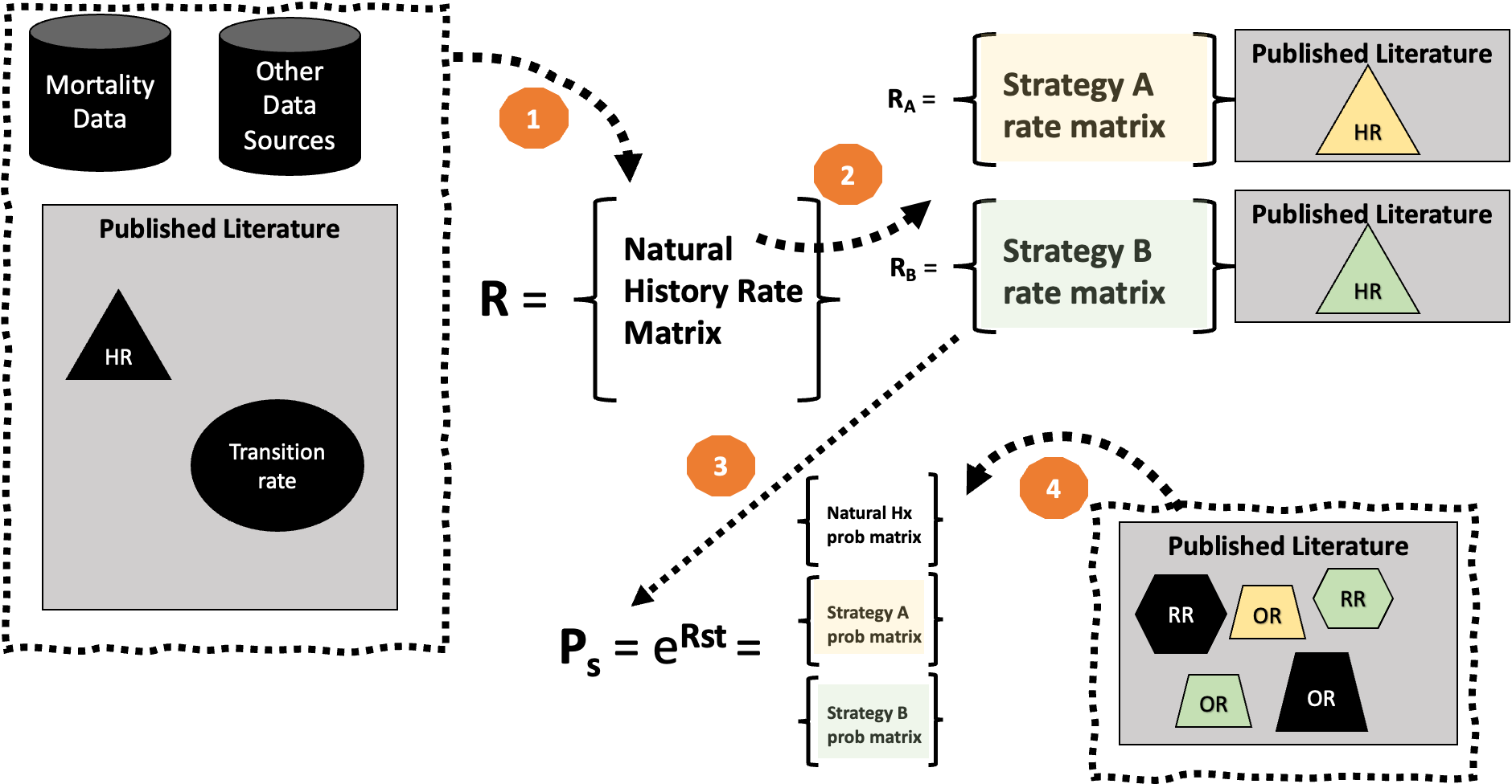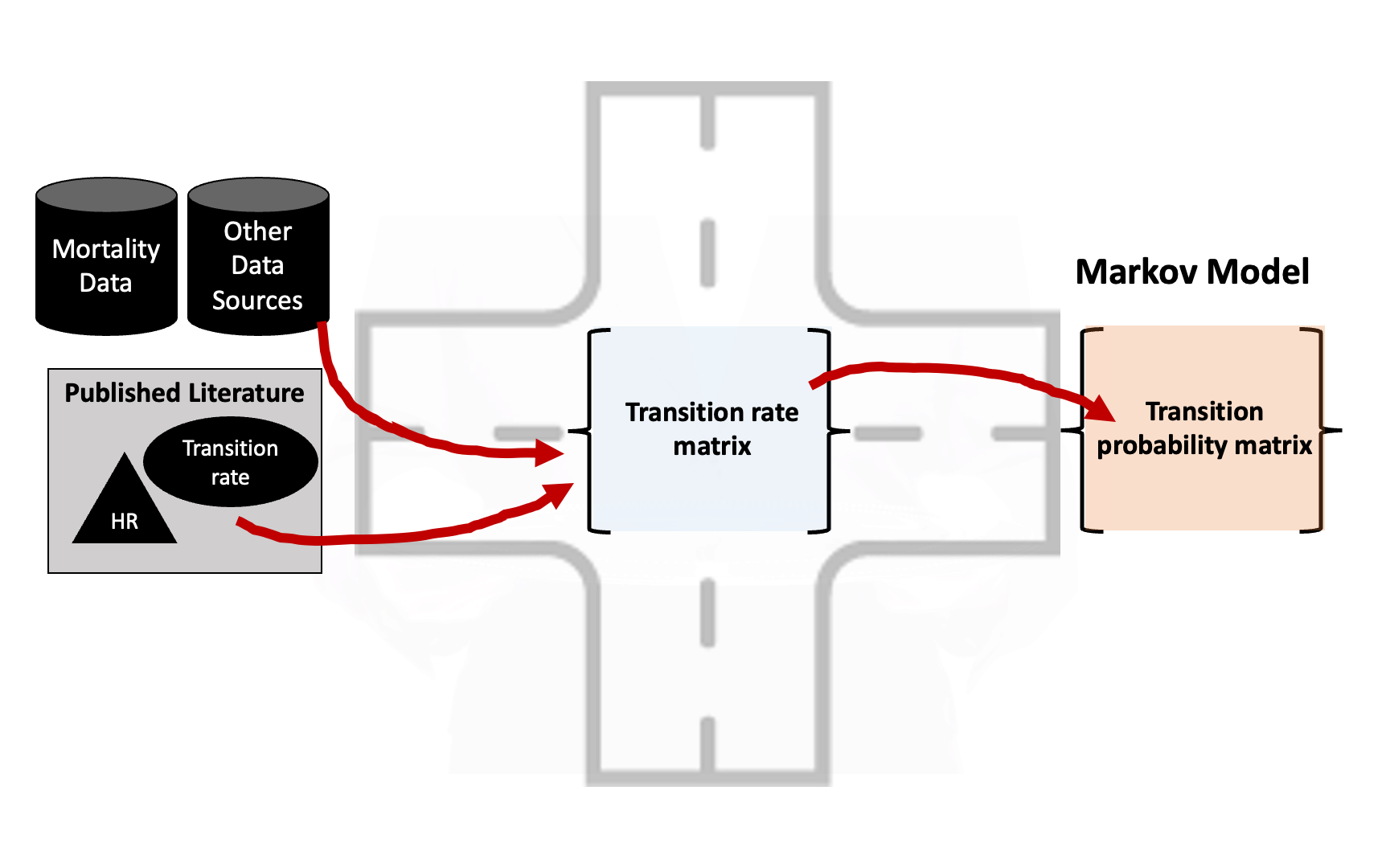 \[ p_{AB}= \frac{r_{AB}}{\sum_S r_{AS}}\big ( 1 - e^{-(\sum_S r_{AS}) t}\big ) \] where \(S\) captures all the health states (i.e., columns) in the transition rate matrix, and \(t\) is the time-step (e.g., \(t=1\) if 1 year, \(t=1/12\) if one month, etc.).